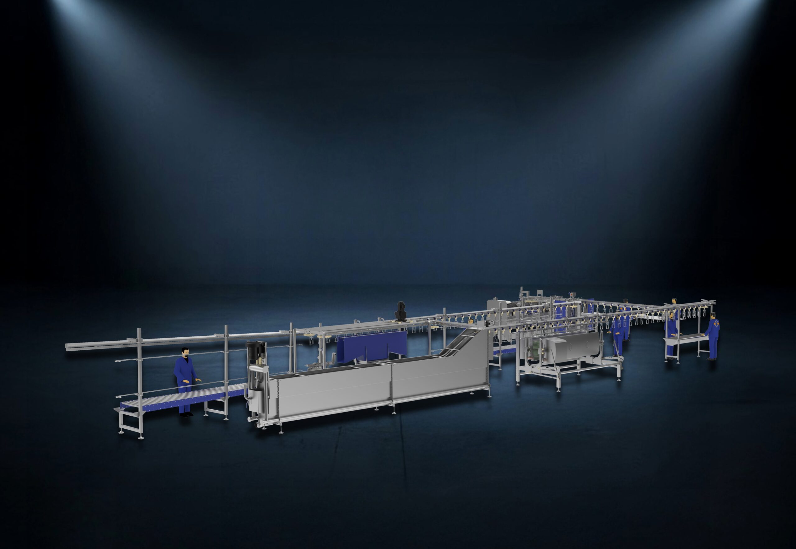 Our killing line is a fully automatic, floor-mounted solution covering stunning, bleeding, scalding, and plucking. The prefabricated system installs quickly and integrates easily into new or existing poultry plants. This line is the perfect first step into automation.